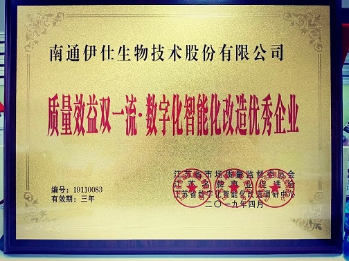 經(jīng)江蘇省市場(chǎng)質(zhì)量監(jiān)督委員會(huì)、江蘇省數(shù)字化智能化改造調(diào)研中心、江蘇名牌事業(yè)促進(jìn)會(huì)綜合調(diào)查審核評(píng)議,南通伊仕生物技術(shù)股份有限公司符合江蘇省質(zhì)量效益雙一流·創(chuàng)新驅(qū)動(dòng)轉(zhuǎn)型升級(jí)優(yōu)秀企業(yè)的條件,被評(píng)為《江蘇省質(zhì)量效益雙一流·創(chuàng)新驅(qū)動(dòng)轉(zhuǎn)型升級(jí)優(yōu)秀企業(yè)》。