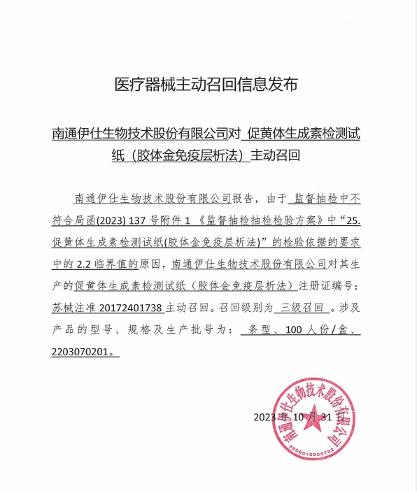 近期,南通伊仕生物技術(shù)股份有限公司生產(chǎn)的排卵檢測(cè)試紙,因第三方檢驗(yàn)判定產(chǎn)品不符合技術(shù)要求中的2.2臨界值。