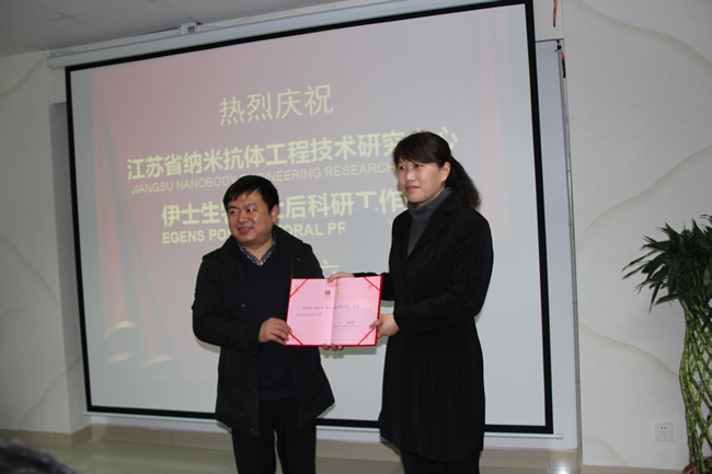 2014年3月20日,南通市伊士生物技術(shù)有限責(zé)任公司在伊士生物研究院會議室舉行了“江蘇省納米抗體工程技術(shù)研究中心、伊士生物博士后研究工作站揭牌儀式”。南通市科技局條件處 劉宏斌副處長,開發(fā)區(qū)經(jīng)貿(mào)局周愛群副局長,科技處程李榮處長,東南大學(xué)生命科學(xué)研究萬亞坤教授,南通大學(xué)吳啟運(yùn)教授,河南科技學(xué)院李桂榮副教授出席了這次揭牌儀式。 會議伊始,伊士生物公司董事長歐衛(wèi)軍先生向到場嘉賓分別介紹了伊士生物公司、納米抗體技術(shù)和研發(fā)中心,隨后分別向萬亞坤教授、吳啟運(yùn)教授、李桂榮副教授頒發(fā)了聘書。