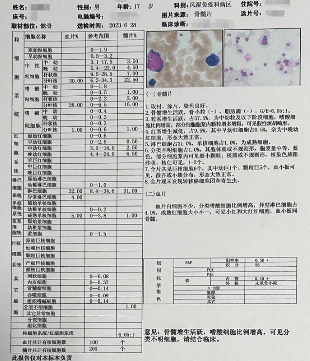 血片意見:白細(xì)胞不少,嗜酸性粒細(xì)胞增高,異型淋巴細(xì)胞4.0%,成熟紅細(xì)胞大小不一,可見小紅、大紅紅細(xì)胞,血小板同骨髓。
